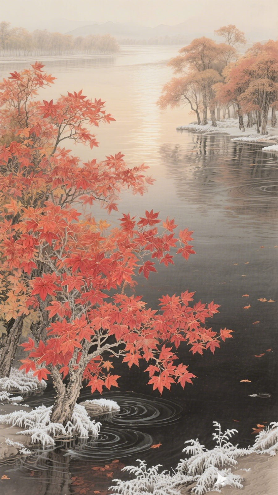 最妙的是江边那几株枫树。在万物渐趋沉寂的季节里,它们却展现出别样的生机。夜霜凝作清露,悄悄浸润着每片枫叶。晨光熹微中,这些叶子仿佛被自然之手细细染过,呈现出动人的红色。诗人用“夜挼霜水染红衣”这般灵动的想象,将枫叶经霜变红的过程,化作深夜有意的浸染,让秋霜成了点缀美丽的丹青妙手。