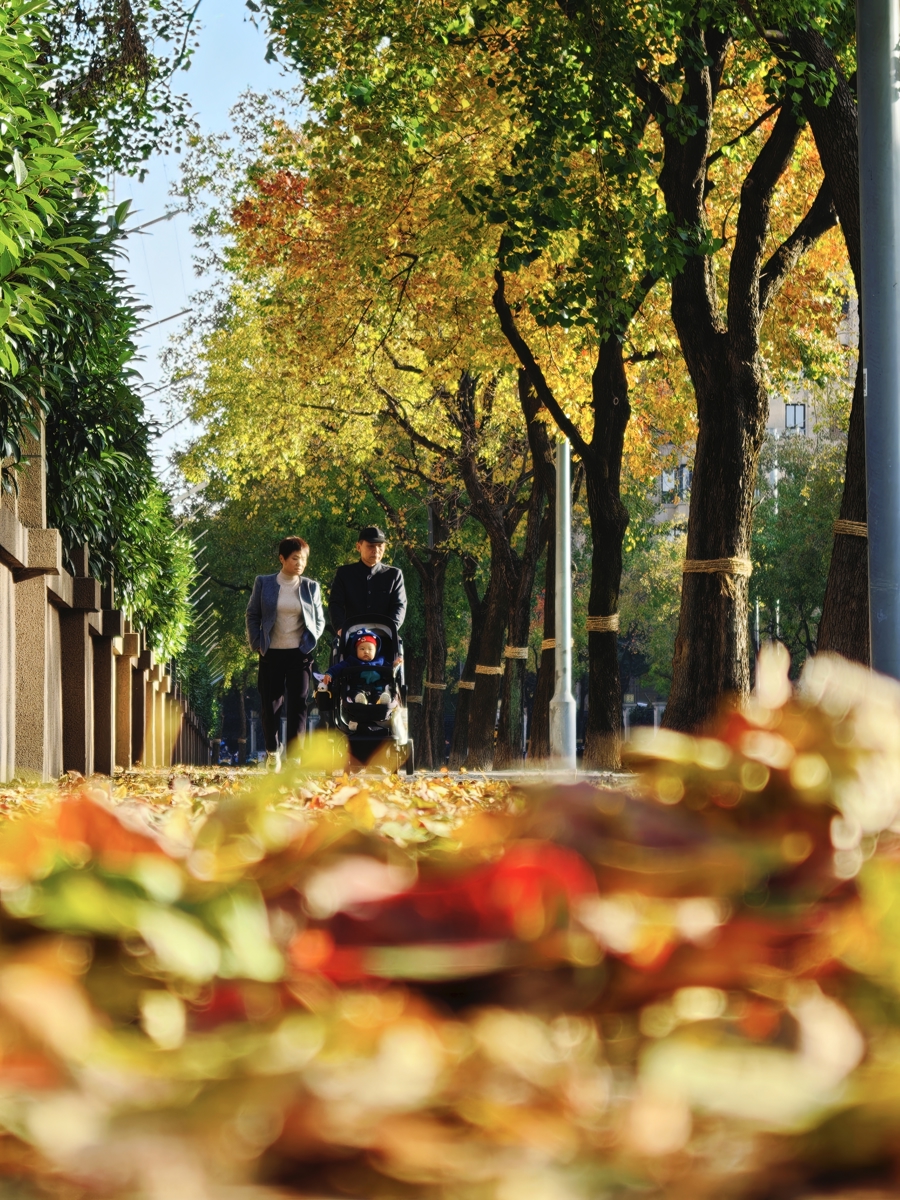徐汇区新增了宾南路(南宁路至宾阳路),并增加了乌桕树种。午后暖阳下,市民欣赏缤纷落叶,尽享浪漫。